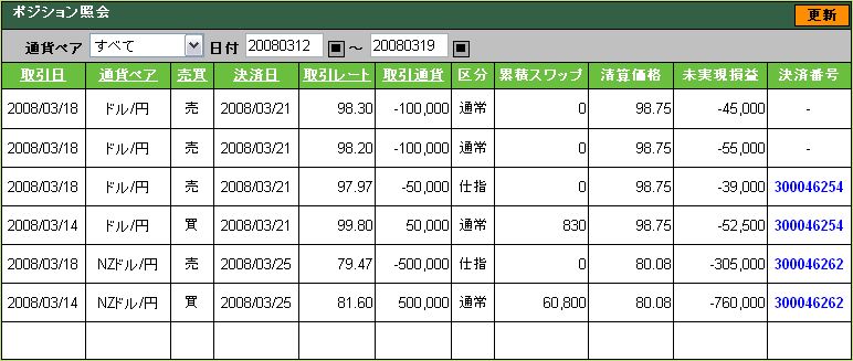 ん~と、損してるのはわかるんだけど、上の4行分は決済したつもりだったんだけど、未実現損益ってコトになっていて、しかも決済日が3/21となっている。